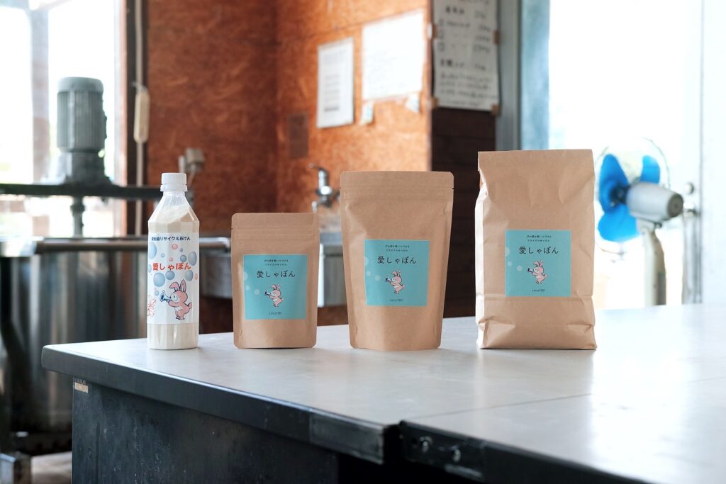 私たちは市内で回収された廃食油から、リサイクル粉せっけん「愛しゃぼん」の製造・販売を行っています。