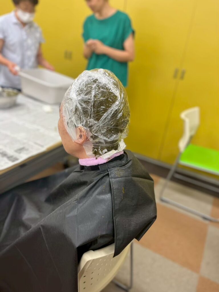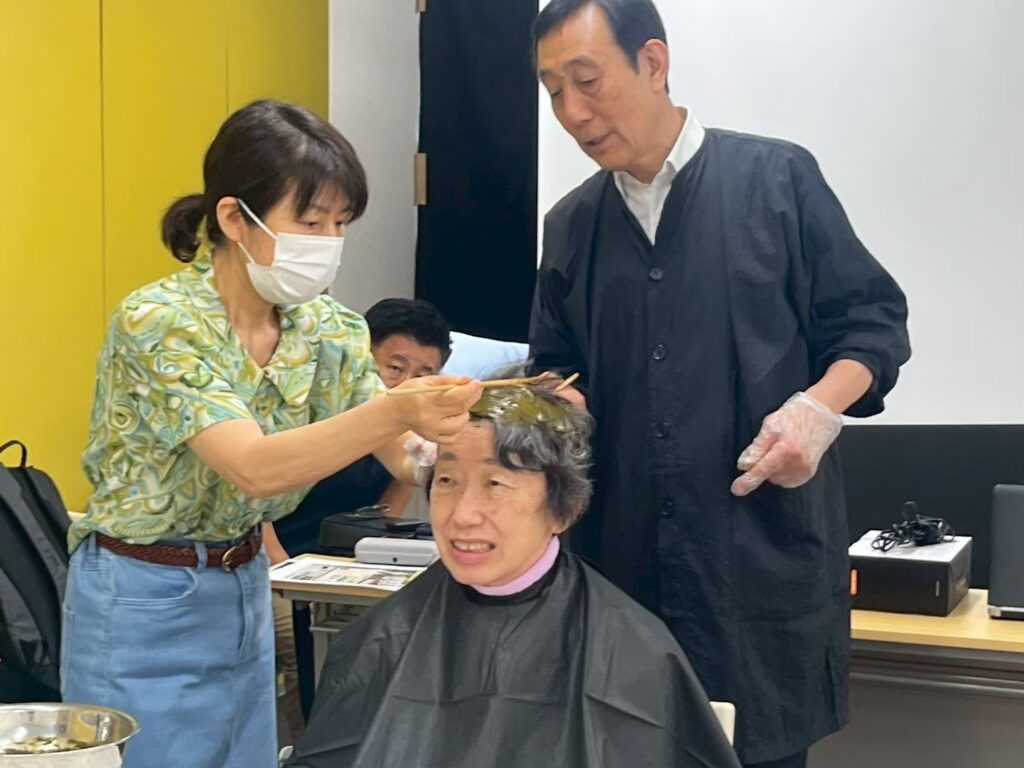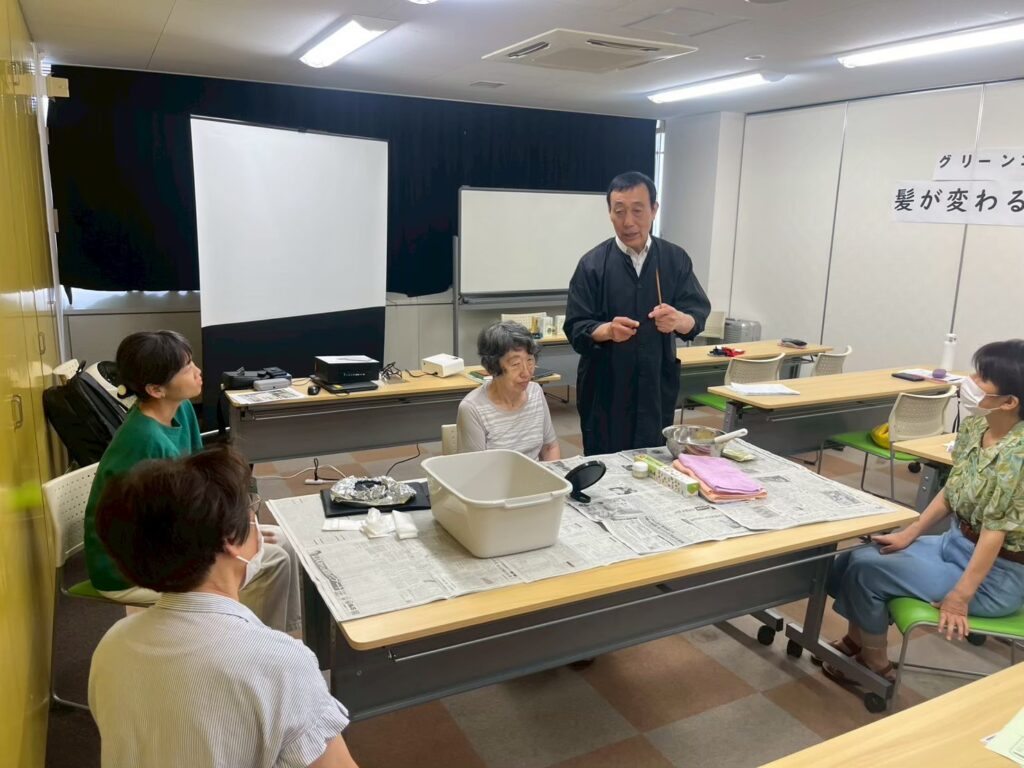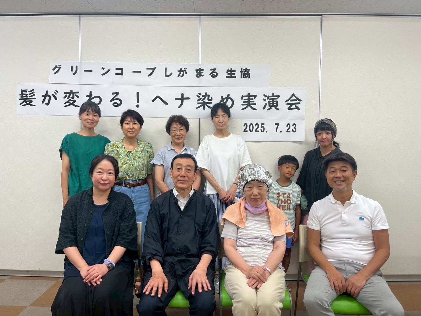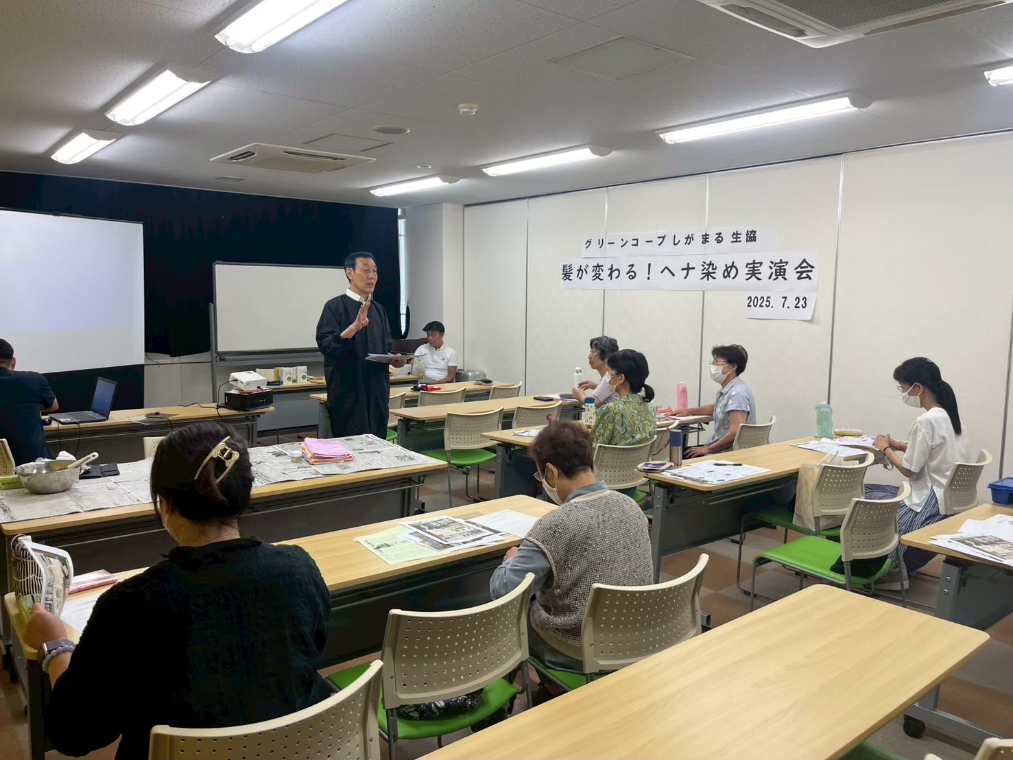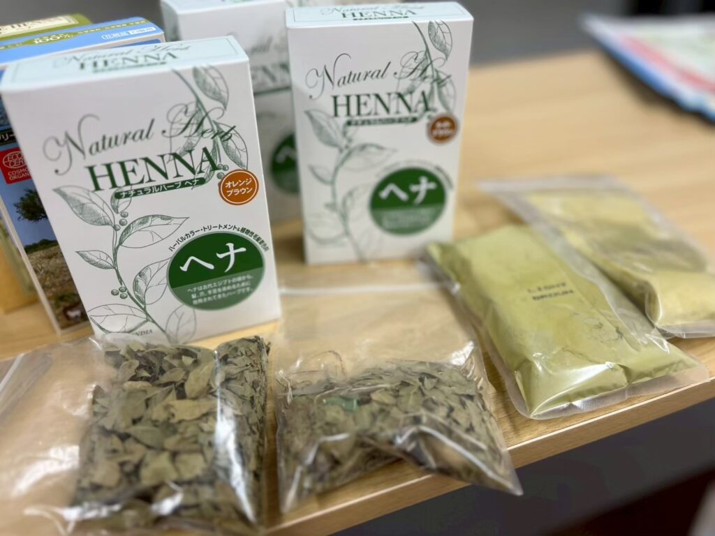白髪染めも化学染料や人工染料ヘナは人体、環境への負荷は大きいです。負荷の少ない天然ヘナの使用を勧めようと7月23日「ヘナ染め実演会」を開催しました。