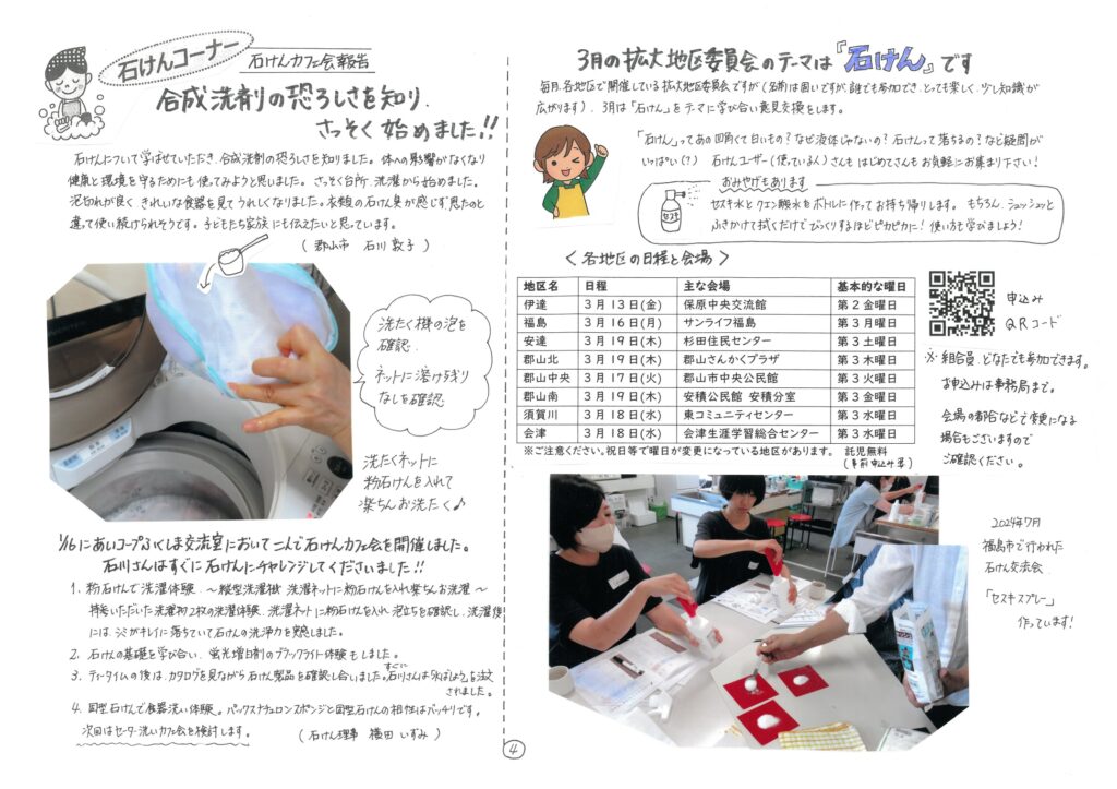 今回は今年のシャボン玉フォーラム開催受入団体、あいコープふくしまさんの週刊誌「ひまわり」より石けんコーナー、石けんカフェの紹介記事をお届けします♪